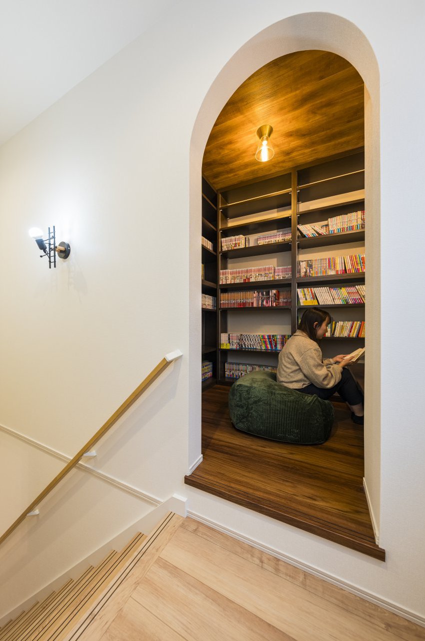 2階の図書室です。本がたくさんあるので、それを置く場所が欲しくて作ってもらいました。今では妻のお気に入りの場所です。また、陽の光が入って気持ちがいい階段の踊り場と、各部屋に合わせて選んだ照明もお気に入りポイントです。