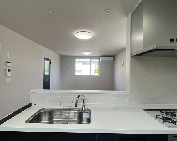 キッチンはからはリビング全体を見渡せるので、お料理中も家族とのコミュニケーションが取りやすいです。小さなお子さんのいる子育て世帯にとっても安心のポイントです。