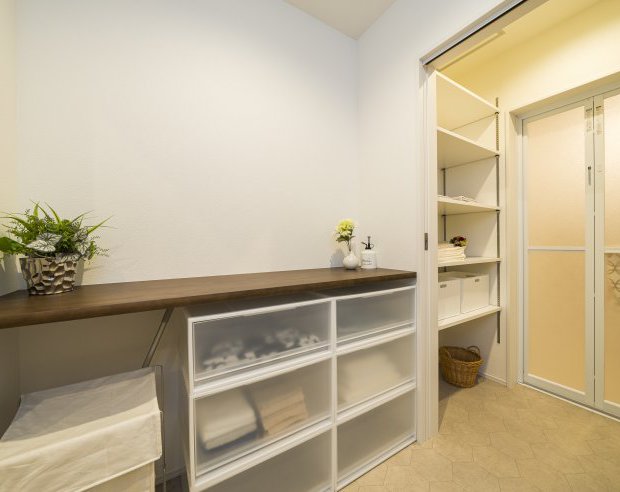 ランドリールームから脱衣所の動線にはカウンターもあり、アイロンがけもスムーズ。収納スペースも多く、空間全体がスッキリ見えます。