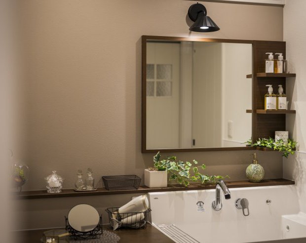 洗面&パウダールームは奥様に人気の幅広サイズで、ゆっくり落ち着けるスペースになりました。リビングとも繋がっているので、お子さんが小さいうちも安心です。